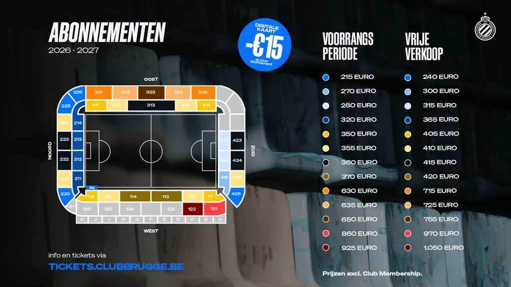Ook dit seizoen bevat een abonnement een aantal mooie extra’s. Zo zijn alle bekerwedstrijden in Jan Breydel tot en met de kwartfinale inbegrepen in jouw abonnement. Een bijkomend voordeel is de optie om voor een digitale abonnementenkaart via de Club Brugge-app te kiezen. Wie hiervoor kiest, ontvangt een korting van 15 euro op de aankoopprijs van het abonnement.