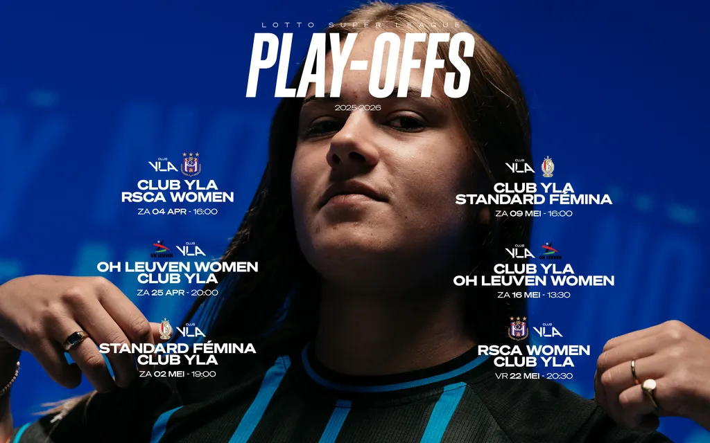 Club YLA kent haar kalender voor Play-Off 1 in de Lotto Super League. Onze dames openen op zaterdag 4 april om 16u00 met een thuiswedstrijd tegen RSCA Women.